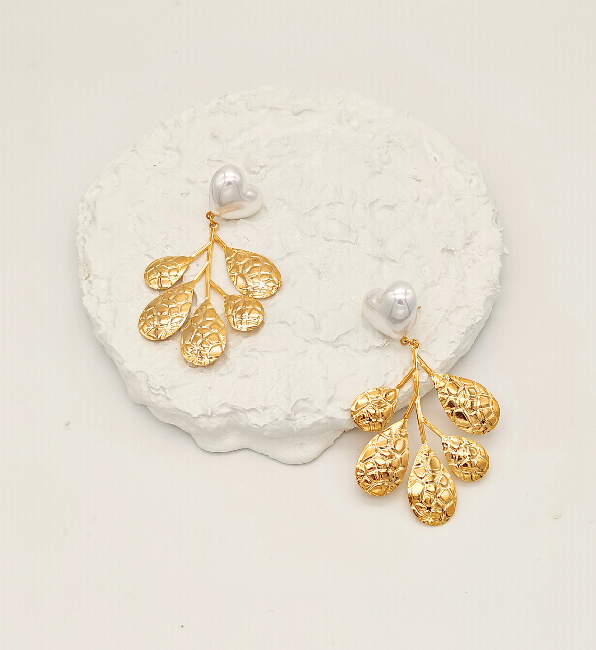 These elegant earrings feature a beautiful design with gold-tone leaves cascading down from a pearl stud. The intricate detailing on the leaves adds texture and sophistication, making them perfect for both casual and formal occasions.